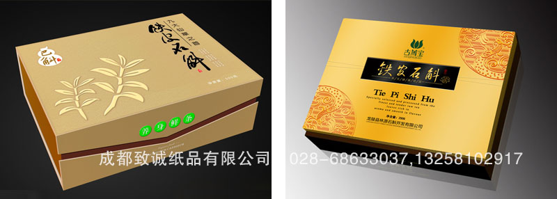 成都包装厂为客户定制两款铁皮石斛礼品盒,第一款:封面采用铜版纸印刷,覆哑膜,“铁皮石斛”文字烫黑金,裱工业纸板,内村为泡沫绸布,围框用棕色特种纸裱工业纸板,结构为书型盒盒型。第二款:封面采用铜版纸印刷,覆哑膜,裱工业纸板,内村为白色EVA,内贴是黄色特种纸,结构为连体天地盖盒型。