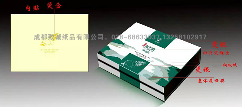 此款包装为乌天麻酒礼品盒包装,成都包装厂考虑到低碳环保的前提下,还要满足客户的个性化需求,并体现其市场定位与品牌价值,必须重点关注工艺设计环节,在工艺方面,我厂设计部门为客户提供了设计方案,包装盒表面采用铜版纸彩印,整体覆哑膜,文字采用烫绿金、凹凸,提升了包装盒视觉和触觉效果。图片采用烫银,增强了包装盒图案的色泽效果。包装盒内衬采用泡沫加金色绸布,大大提升了包装盒的档次