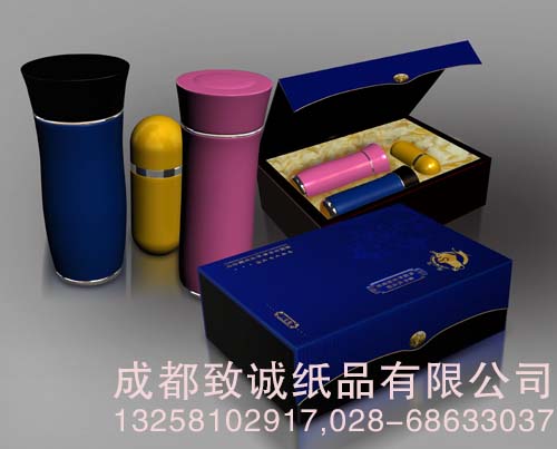 成都致诚纸品有限公司为客户定制的此款包装为一款高档的保温杯礼品盒,礼品盒里面共放3个保温杯,分别是爸爸、妈妈、小孩的。