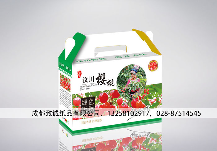 本款包装盒是为阿坝州汶川的农业合作社定制的汶川樱桃包装盒,该包装盒按照重量分为:三斤装和五斤装两种款式,如下图:樱桃包装盒主色调是白色,绿色,市面上的樱桃包装盒大多是采用红色为主色调,该客户是想用绿色区别于其他商家的包装盒,而包装盒正面采用“正在采摘樱桃的羌族姑娘”作为主图,成为该款包装盒的亮点。